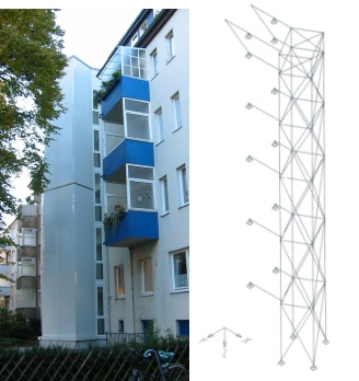 Konstruktion5-geschossige Stahlkonstruktion auf Stahlbetonwänden mit Plattengründung für die Aufzugsunterfahrt. Bei dem Aufzugsturm handelt es sich um eine fachwerkähnliche Stahlkonstruktion, die auf eine örtlich hergestellte Unterfahrt aus Stahlbeton aufgesetzt wurde. BesonderheitDer eigentliche Aufzugsturm ist um ca. 45° gegenüber der Gebäudeaußenwand gedreht und die verbindende Decke zwischen Gebäude und Aufzugsschacht schließt an die Zwischenpodeste des vorhandenen Treppenhauses an. Auf Grund der gewünschten Geometrie waren die Verdrehungen aus dem Lastfall Wind, und daraus resultierenden horizontalen Auflagerkräfte am bestehenden Gebäude, unbedingt auf ein Minimum zu begrenzen, um die Gebrauchstauglichkeit zu gewährleisten. |